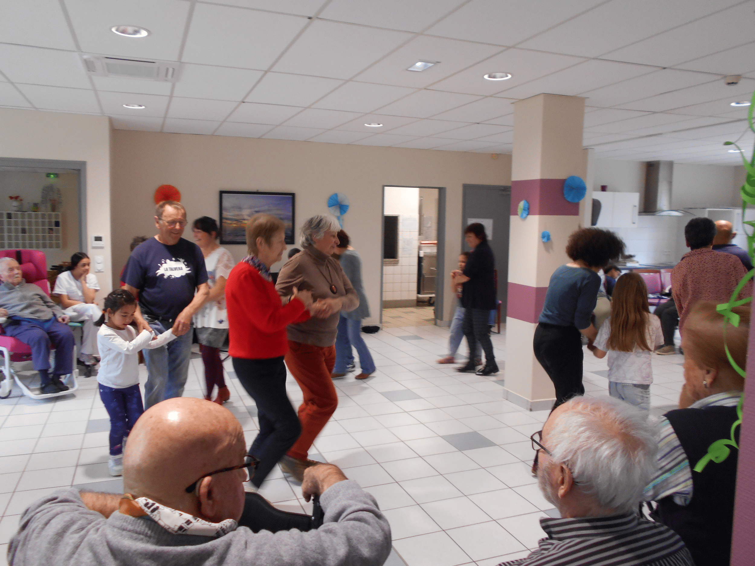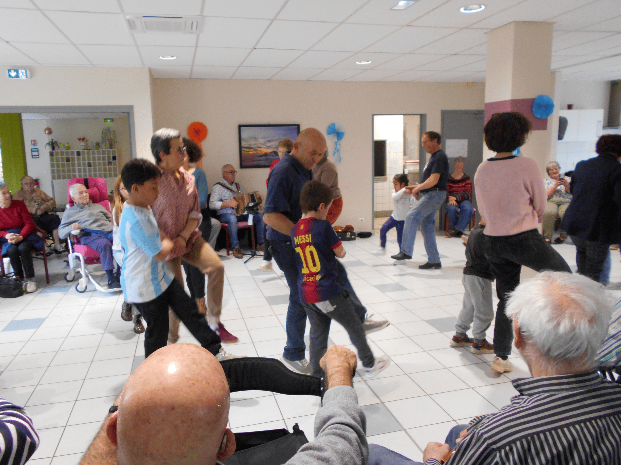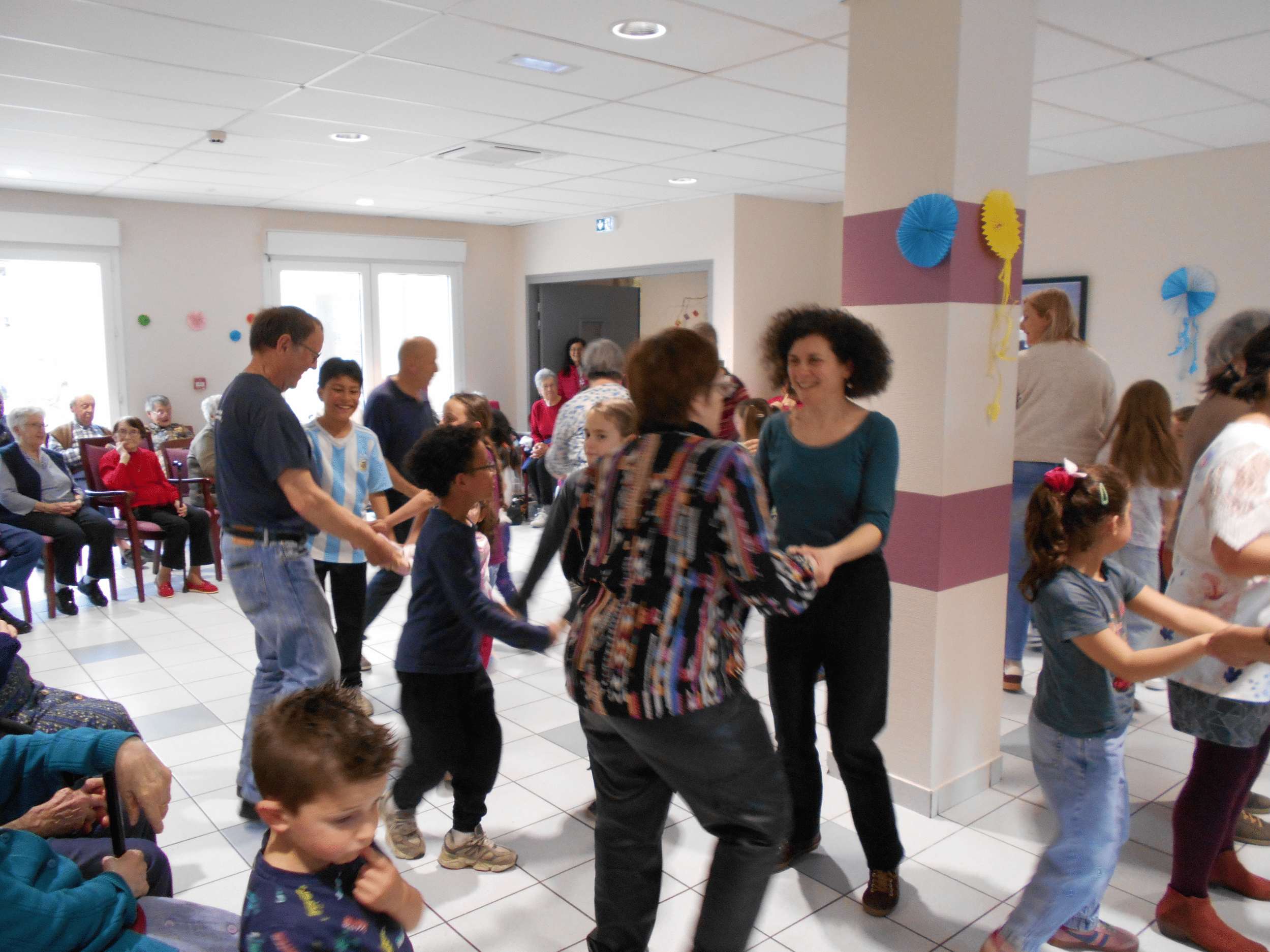 Ils ont pu ensuite, s’initier aux danses traditionnelles en compagnie de la troupe qui accompagne Brigitte et les 3 musiciens. Certains timides au début, ils ont vite emboité le pas des danseurs et danseuses.